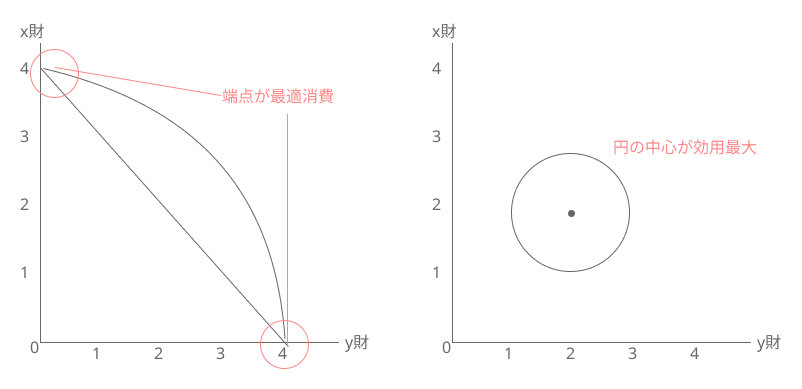 試験では稀に、原点に対して凹(へこんでいる)形状や、円形の無差別曲線が登場することがあります。これらは、「消費量が多ければ多いほど良い」という通常の前提が当てはまらないケースです。原点に対して凹な無差別曲線は限界代替率が逓増していることを意味し、結果として「どちらか一方の財のみを消費する端点」が最適消費点となります。また、円形の無差別曲線は、消費量がある一定の「飽和点(至福点)」を超えると、逆に満足度が低下することを示しています。こうした特殊なグラフが出題された際は、基本に立ち返り、「予算制約線の範囲内で最も効用が高くなる点」を論理的に見極めることが重要です。